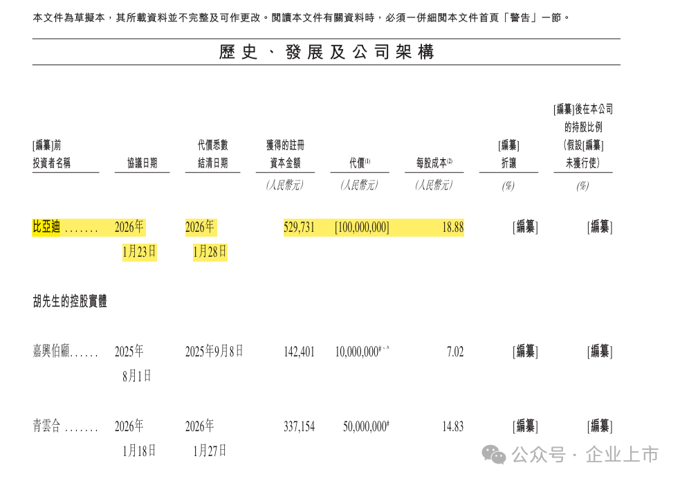 2026 年 1 月 23 日,比亚迪、本公司及当时的现有股东订立了额外的 Pre-C 轮增资协议,据此,比亚迪同意以代价人民币 100,000,000 元认购本公司新增注册资本人民币 529,731 元(已于 2026 年 1 月 28 日全数结清)。